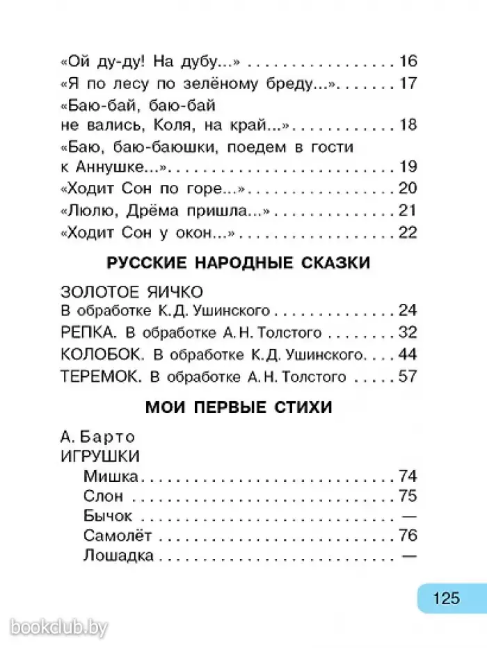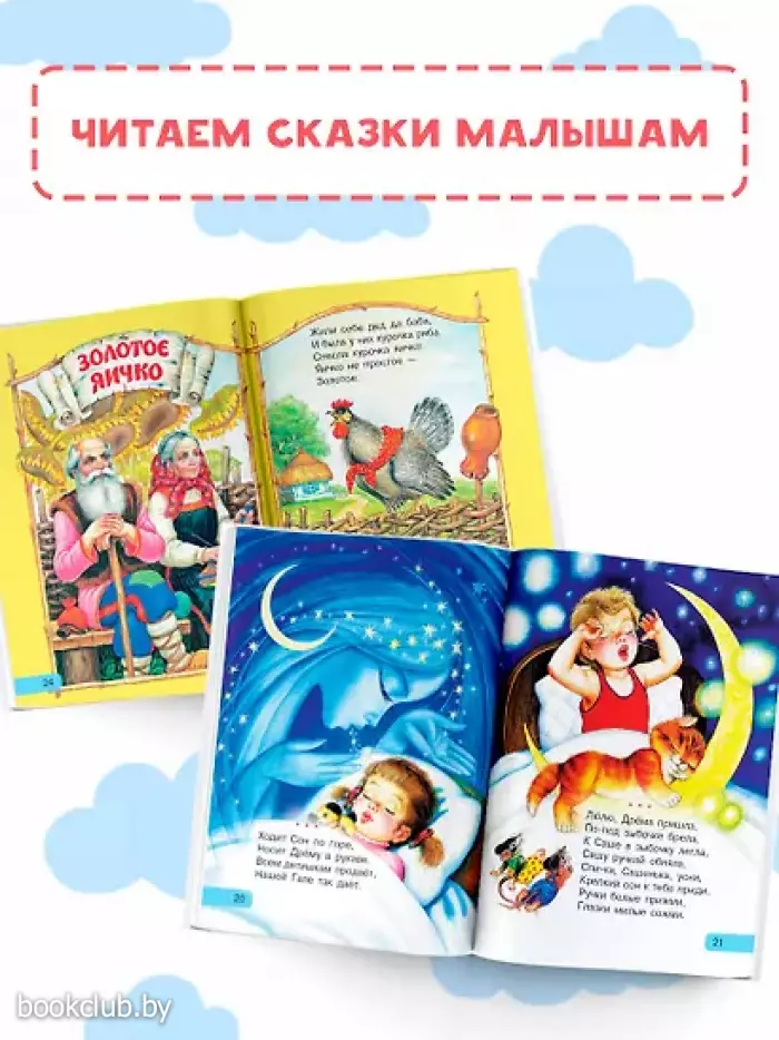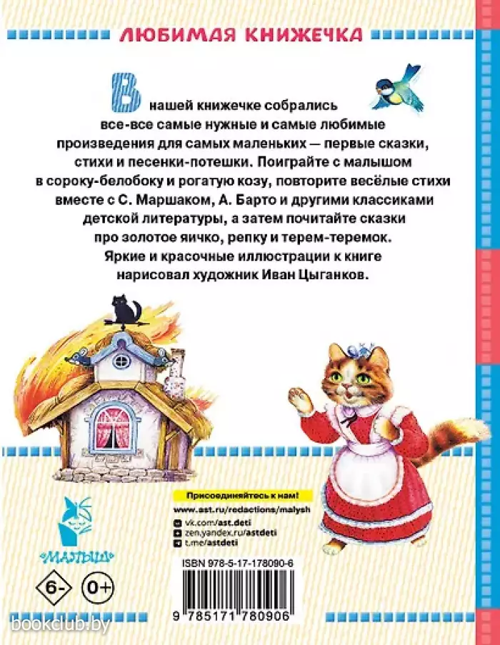 В нашей книжечке собрались все-все самые нужные и самые любимые произведения для самых маленьких – первые сказки, стихи и песенки-потешки. Поиграйте с малышом в сороку-белобоку и рогатую козу, повторите весёлые стихи вместе с С. Маршаком, А. Барто и другими классиками детской литературы, а затем почитайте сказки про золотое яичко, репку и терем-теремок. Яркие и красочные иллюстрации к книге нарисовал художник Иван Цыганков.