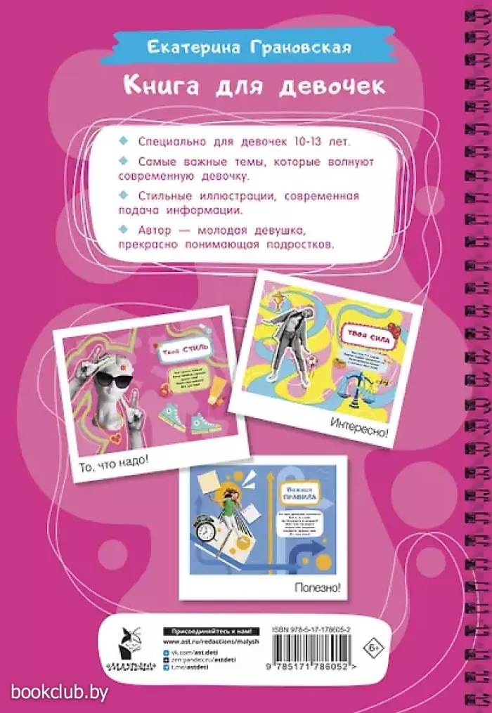 Переходный возраст традиционно называют «трудным». Как помочь ребёнку уверенно войти в незнакомый мир подростков? Позитивная «Книга для девочек. Всё, что нужно для современной девчонки» создана специально для детей 10-13 лет: написана молодым автором, стильно оформлена, а также удобна и практична — благодаря спирали страницы легко перекидываются из стороны в сторону, открываясь на 360 градусов. Это настоящая энциклопедия современной девочки, в которой понятно рассказано о красоте и стиле, общении, лидерских качествах, диалоге с родителями, питании, гигиене, финансовой грамотности, безопасности в интернете и многом-многом другом. Книга поможет подростку лучше понять себя, стать увереннее, повысить самооценку, научиться отстаивать свои интересы, гордиться своей индивидуальностью. Идеальный подарок для вашей дочери, внучки или племянницы! Хорошая идея подарка на день рождения и 8 марта однокласснице или подружке — девочкам будет что обсудить!