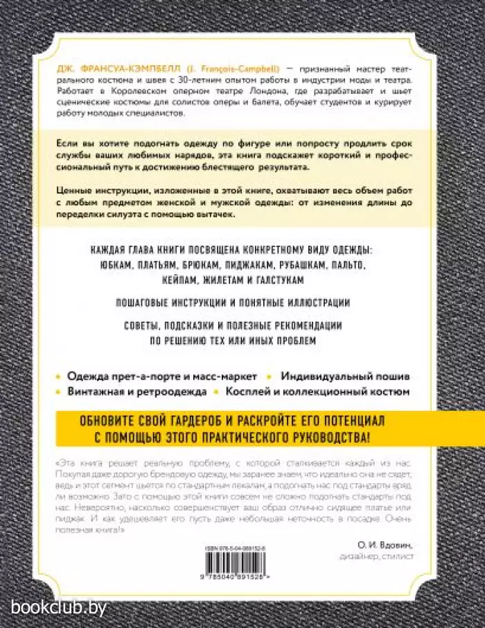 Подробнейшее и практичное пособие от автора с уникальным опытом пошива и реставрации костюмов любого уровня - от театральных до от кутюр, поможет превратить любую одежду, будь-то купленная в магазине или сшитая индивидуально, в идеальный наряд, как влитой сидящий по фигуре. Если вы хотите всегда выглядеть безупречно, приемы и советы автора окажут вам неоценимую помощь! Будьте всегда элегантны и одеты "с иголочки"!