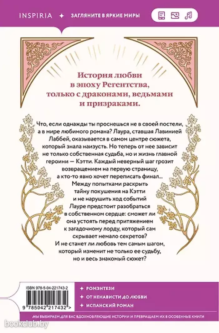 Что, если однажды ты проснешься не в своей постели, а в мире любимого романа? Лаура, ставшая Лавинией Лаббей, оказывается в самом центре сюжета, который знала наизусть. Но теперь от нее зависит не только собственная судьба, но и жизнь главной героини — Кэтти. Каждый неверный шаг грозит возвращением на первую страницу, а кто-то явно хочет переписать финал... Между попытками раскрыть тайну покушения на Кэтти и не нарушить ход событий, Лауре предстоит разобраться в собственном сердце: сможет ли она устоять перед притяжением к загадочному лорду, который сам скрывает немало секретов? И не станет ли любовь тем самым шагом, который изменит не только ее судьбу, но и весь знакомый сюжет?