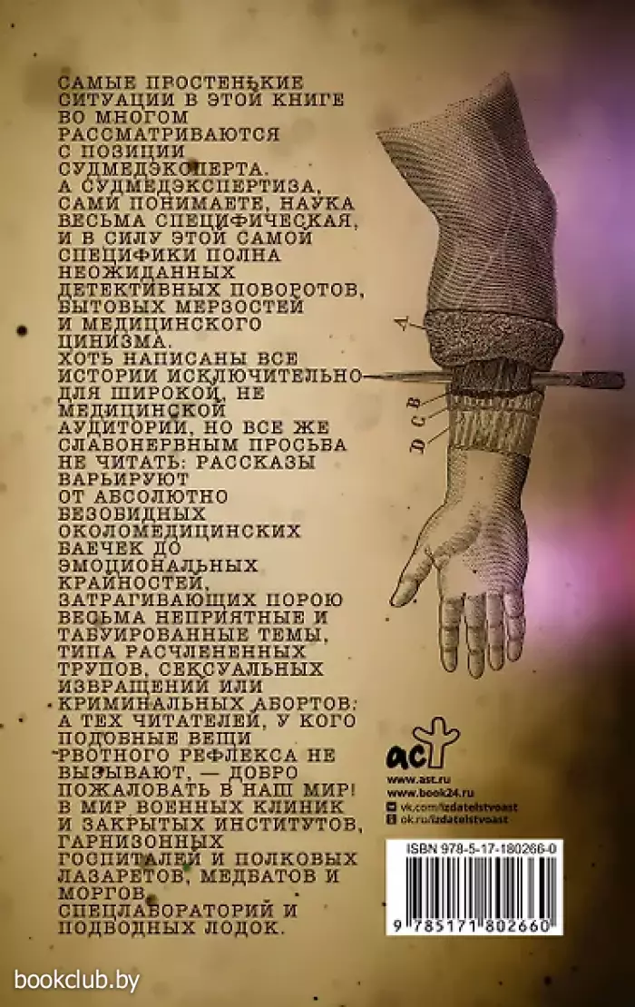 Самые простенькие ситуации в этой книге во многом рассматриваются с позиций судмедэксперта. А судмедэкспертиза или судмедэкспертиза, сами понимаете, наука весьма специфическая, и в силу этой самой специфики полна неожиданных детективных поворотов, бытовых мерзостей и медицинского цинизма. Хоть написаны все истории исключительно для широкой, не медицинской аудитории, но всё же слабонервным просьба не читать — рассказы варьируют от абсолютно безобидных околомедицинских баечек до эмоциональных крайностей, затрагивающих порою весьма неприятные и табуированные темы, типа расчлененных трупов, сексуальных извращений или криминальных абортов. А тем читателям, у кого подобные вещи рвотного рефлекса не вызывают — добро пожаловать в наш мир! В мир военных клиник и закрытых институтов, гарнизонных госпиталей и полковых лазаретов, медбатов и моргов, спецлабораторий и подводных лодок.