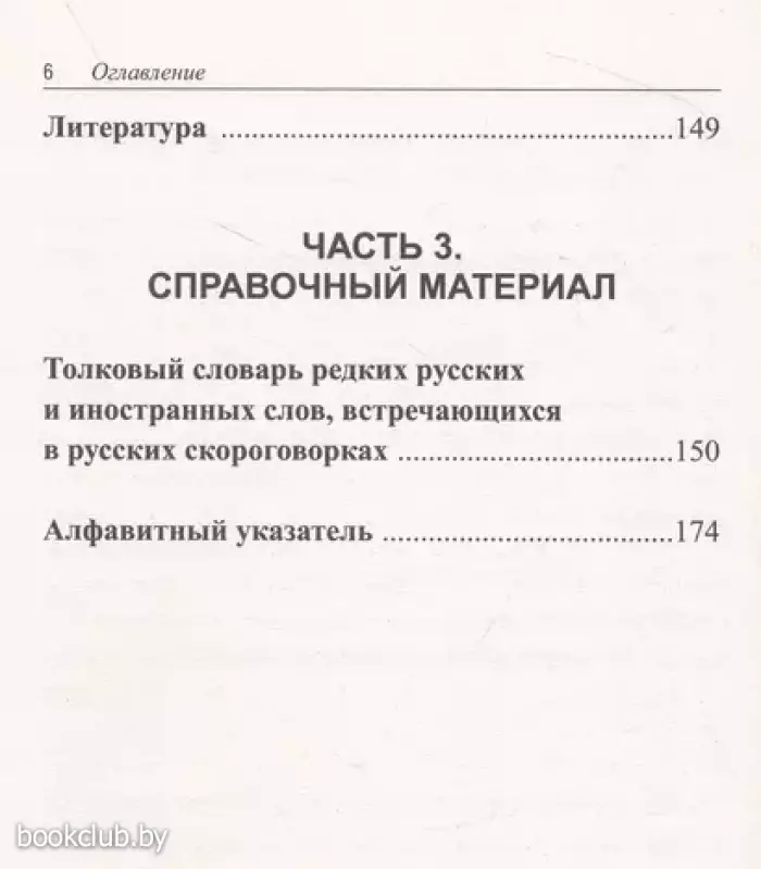 словарь некоторых редких слов и алфавитный указатель слов, встречающихся в скороговорках. Уникальность пособия