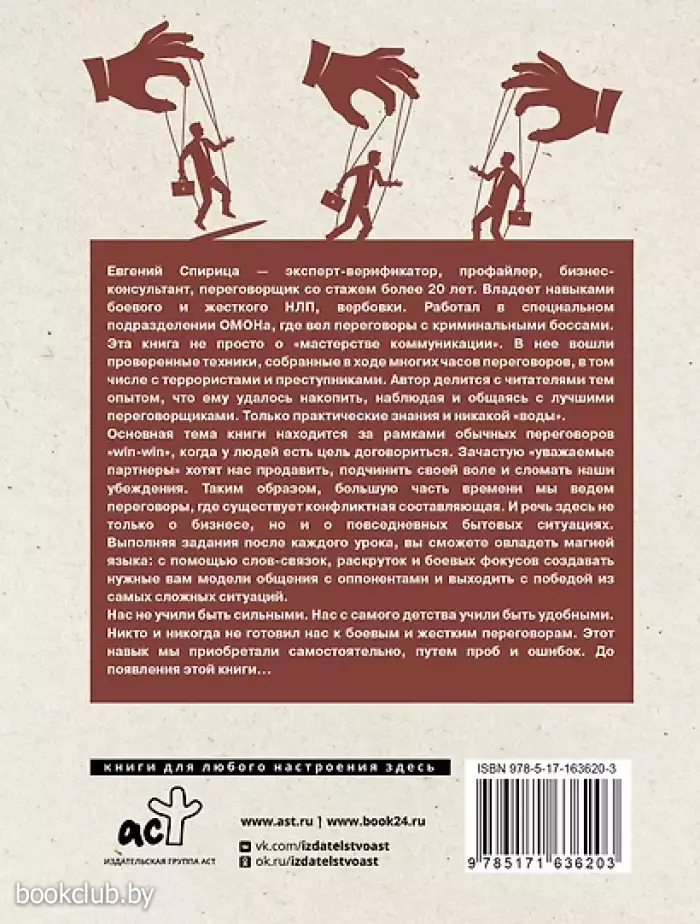 Евгений Спирица — эксперт-верификатор, профайлер, бизнес-консультант, переговорщик со стажем более 20 лет. Владеет навыками боевого и жесткого НЛП, вербовки. Работал в специальном подразделении ОМОНа, где вел переговоры с криминальными боссами. Эта книга не просто о «мастерстве коммуникации». В нее вошли проверенные техники, собранные в ходе многих часов переговоров, в том числе с террористами и преступниками. Автор делится с читателями тем опытом, что ему удалось накопить, наблюдая и общаясь с лучшими переговорщиками. Только практические знания и никакой «воды». Основная тема книги находится за рамками обычных переговоров «win-win», когда у людей есть цель договориться. Зачастую «уважаемые партнеры» хотят нас продавить, подчинить своей воле и сломать наши убеждения. Таким образом большую часть времени мы ведем переговоры, где существует конфликтная составляющая. И речь здесь не только о бизнесе, но и о повседневных бытовых ситуациях. Выполняя задания после каждого урока, вы сможете овладеть магией языка: с помощью слов-связок, раскруток и боевых фокусов создавать нужные вам модели общения с оппонентами и выходить с победой из самых сложных ситуаций. Нас не учили быть сильными. Нас с самого детства учили быть удобными. Никто и никогда не готовил нас к боевым и жестким переговорам. Этот навык мы приобретали самостоятельно, путем проб и ошибок. До появления этой книги…