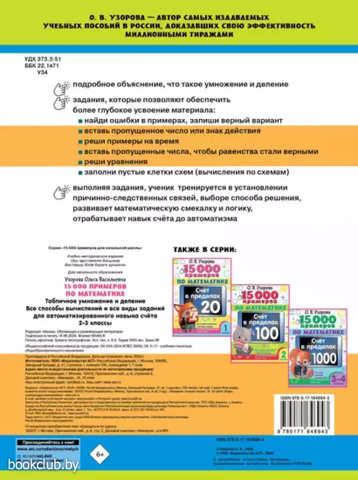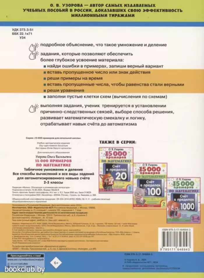 Книга «15 000 примеров по математике. Табличное умножение и деление. Все способы вычислений и все виды заданий для автоматизированного навыка счета. 2- 3 классы» - отличное приобретение для вас и ваших близких. Для вашего удобства при оформлении заказа по телефону назовите код товара: 407161