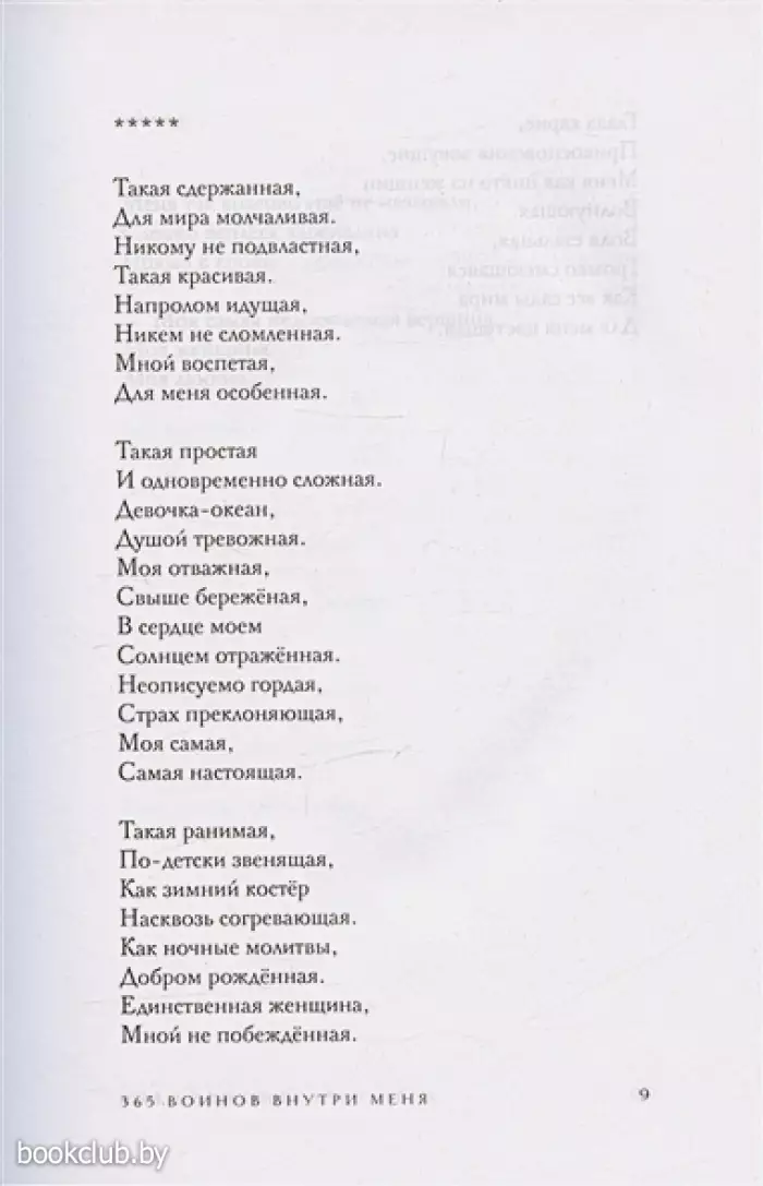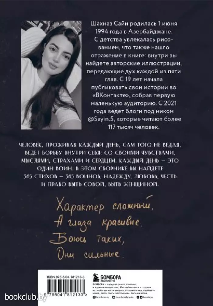 «365 воинов внутри меня» — это сборник молодой поэтессы Шахназ Сайн. Она начала опубликовать свои истории во «ВКонтакте» с 19 лет, собрав первую маленькую аудиторию. Позже ее узнали как автора тонких лирических романов «Таха», «На периферии», «Дороже вдоха», серии историй «Раз и Навсегда..», а ее стихи легли в основу многих песен, в том числе Миши Марвина.