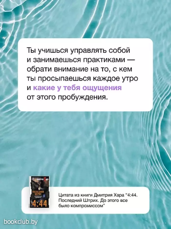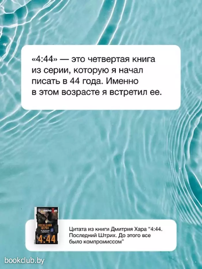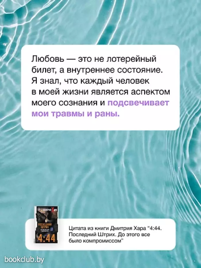 Роман-притча "4:44" известного трансформационного тренера, писателя Дмитрия Хары — это последний штрих к нашумевшему бестселлеру "П. Ш.", с которым тысячи читателей взглянули на свою жизнь по-новому и изменили ее к лучшему. Вместе с главным героем ты шаг за шагом проложишь себе тропинку к внутренней гармонии, цельности и осознанности — через духовное самопознание, которое в конечном счете приведет к истинному счастью. Научишься жить без компромиссов — и обретешь любовь, которая позволит тебе сиять еще ярче, ощущать радость в каждом мгновении.