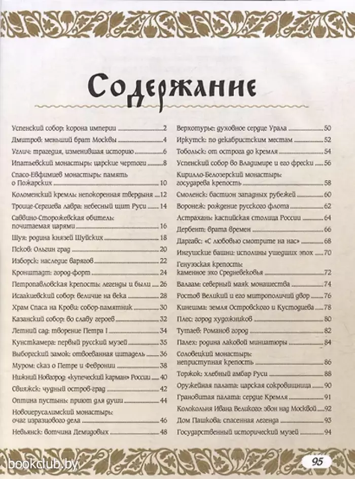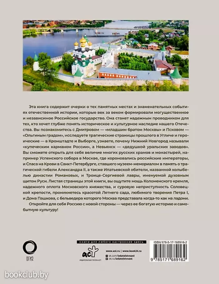Эта книга содержит очерки о тех памятных местах и знаменательных событиях отечественной истории, которые век за веком формировали могущественное и независимое Российское государство. Она станет надежным проводником для тех, кто хочет глубже понять историческое и культурное наследие нашего Отечества. Вы познакомитесь с Дмитровом — "младшим братом Москвы" и Псковом — "Ольгиным градом", исследуете трагические страницы прошлого в Угличе и героические в Кронштадте и Выборге, узнаете, почему Нижний Новгород называли "купеческим карманом России", а Невьянск — "дедушкой уральских заводов". Вы сможете открыть для себя величие многих русских храмов и монастырей, например, Успенского собора в Москве, где короновались российские императоры, и Спаса на Крови в Санкт-Петербурге, ставшего музеем-памятником в честь трагической гибели Александра II, а также Ипатьевской обители, названной колыбелью династии Романовых, и Троице-Сергиевой лавры, именуемой духовным щитом Руси. Листая страницы этой книги, вы ощутите мощь Коломенского кремля, надежного оплота Московского княжества, и суровую неприступность Соловецкой крепости, проникнетесь красотой Летнего сада, любимого творения Петра I, и дома Пашкова, с бельведера которого Москва представала когда-то как на ладони. Откройте для себя Россию с новой стороны — через ее богатую историю и самобытную культуру!