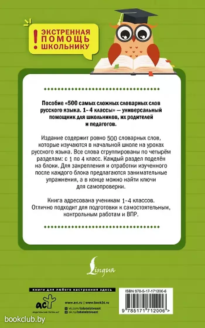 Литинская Ксения Васильевна – преподаватель с многолетним опытом, автор различных учебных пособий для школьников. В данном издании представлено ровно 500 самых сложных словарных слов русского языка, с которыми у учащихся начальной школы чаще всего возникают проблемы. Выучить правописание и закрепить знания помогут занимательные задания. В конце книги находятся ключи для самопроверки. Упражнения можно выполнять прямо на страницах учебника, а удобный формат позволит взять книгу с собой и не даст заскучать даже в длительной поездке. Издание подойдет для учеников начальной школы, родителей и педагогов.