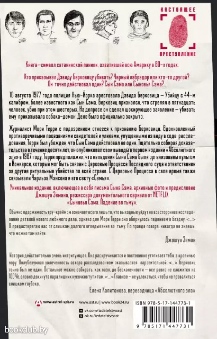 В семидесятые годы серийный убийца Дэвид Берковиц, прозванный Сыном Сэма, наводил ужас на всю Америку. После того, как Берковица поймали, журналист Мори Терри выдвинул теорию, что Берковиц действовал не один, а за его поступками стоял целый религиозный культ. На доказательство своей теории Терри потратил целых десять лет. Плодом его усилий стала эта книга.