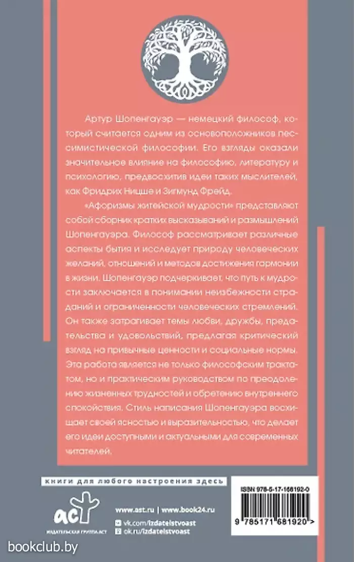Артур Шопенгауэр — немецкий философ, который считается одним из основоположников пессимистической философии. Его взгляды оказали значительное влияние на философию, литературу и психологию, предвосхитив идеи таких мыслителей, как Фридрих Ницше и Зигмунд Фрейд. "Афоризмы житейской мудрости" представляют собой сборник кратких высказываний и размышлений Шопенгауэра. Философ рассматривает различные аспекты бытия и исследует природу человеческих желаний, отношений и методов достижения гармонии в жизни. Шопенгауэр подчеркивает, что путь к мудрости заключается в понимании неизбежности страданий и ограниченности человеческих стремлений. Он также затрагивает темы любви, дружбы, предательства и удовольствий, предлагая критический взгляд на привычные ценности и социальные нормы. Эта работа является не только философским трактатом, но и практическим руководством по преодолению жизненных трудностей и обретению внутреннего спокойствия. Стиль написания Шопенгауэра восхищает своей ясностью и выразительностью, что делает его идеи доступными и актуальными для современных читателей.