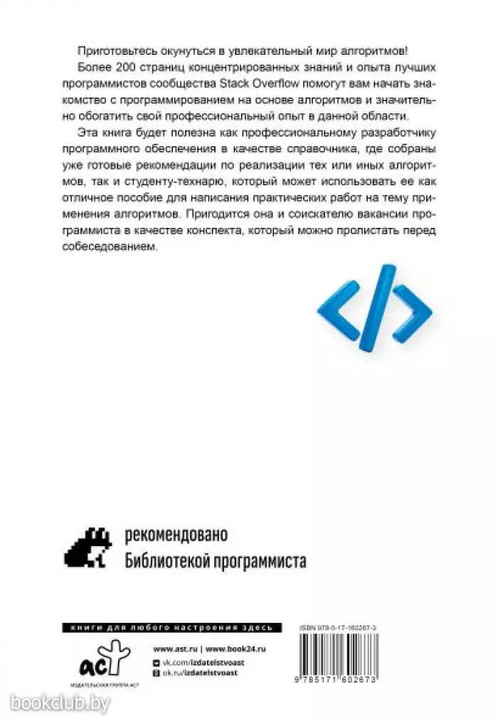 Каждый раздел книги базируется на топовых материалах сайта Stack Overflow на тему алгоритмов и представляет собой краткое описание алгоритма с примерами, реализованными на разных языках программирования или в псевдокоде. В числе прочих рассмотрены алгоритмы работы с графами, алгоритмы быстрого поиска и сортировки, алгоритмы обработки строковых переменных и многое другое.