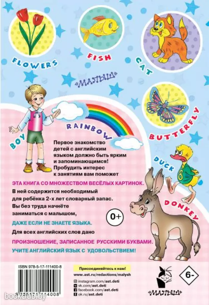 Книга "Английский для малышей в картинках" - это учебное пособие для самых маленьких. Книга рассчитана на детей от двух лет, поэтому в ней подобран соответствующий возрасту словарный запас. Для удобства изучения ко всем словам дано произношение, написанное русскими буквами. Темы тоже хорошо знакомы ребенку. Это приветствие, прощание, семья, дом, природа, времена года, числа, животные, еда, одежда, предметы обихода и многое другое. И, если ребенок еще чего-то не знает, у вас есть возможность изучить это с ним сразу на двух языках. В книге яркие, запоминающиеся иллюстрации, крупный шрифт и плотная бумага.