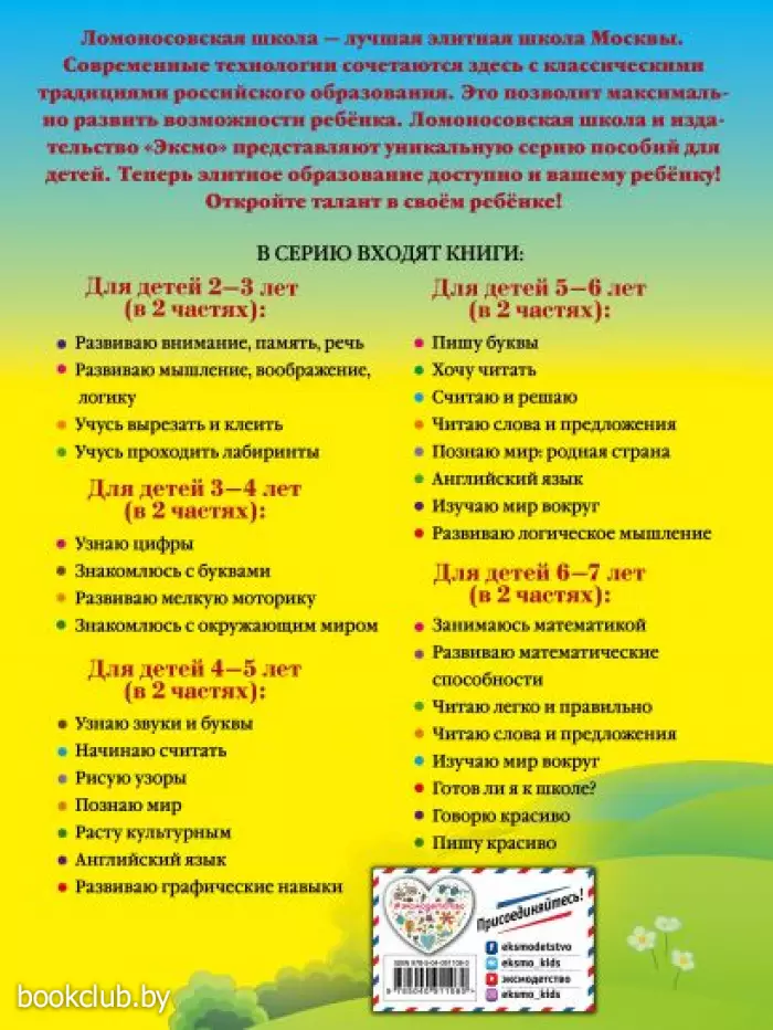 Издательство «Эксмо» и Ломоносовская школа представляют уникальную серию пособий для детей. Ломоносовская школа — лучшая элитная школа Москвы. Современные технологии сочетаются здесь с классическими традициями российского образования. Это позволяет максимально развить возможности ребенка. Покупаю серию развивающих книг для своего ребенка, вы поможете ему: