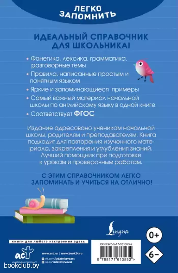 Книга «Английский язык. Кратко и просто. 2–4 классы (ФГОС)» - станет прекрасным дополнением вашей библиотеки. Для вашего удобства при оформлении заказа по телефону назовите код товара: 409125