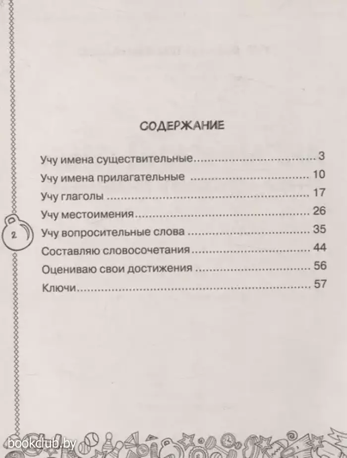 Выполняя задания, можно узнать об именах существительных и прилагательных, глаголах, местоимениях и вопросительных словах, а также научиться составить словосочетания.
