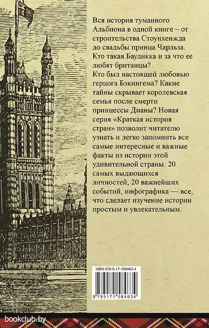 Вся история туманного Альбиона в одной книге - от строительства Стоунхенжда до свадьбы принца Чарльза. Кто такая Баудикка и за что ее любят британцы? Кто был настоящей любовью герцога Бэкингема? Какие тайны скрывает королевская семья после смерти принцессы Дианы? Новая серия "История на пальцах" позволит читателю узнать и легко запомнить все самые интересные и важные факты из истории этой удивительной страны. 20 самых выдающихся личностей, 20 важнейших событий, инфографика - все, что сделает изучение истории простым и увлекательным.