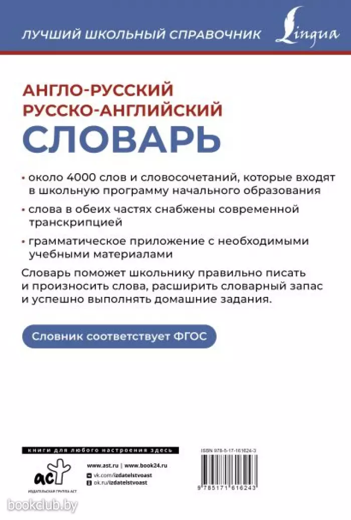 Словарь содержит около 4000 слов и словосочетаний, которые входят в школьную программу начального образования. Этот справочник станет незаменимым помощником школьнику, ведь здесь содержатся все самые нужные слова и словосочетания, он компактен и прост в обращении, содержит современную транскрипцию, а также дополнен грамматическим справочником с необходимыми правилами. Словник соответствует ФГОС.