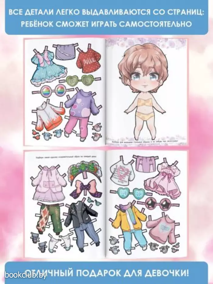 И куколки, и одежда сделаны из плотного картона, и легко выдавливаются прямо со страниц — для игры не понадобятся ножницы и клей.