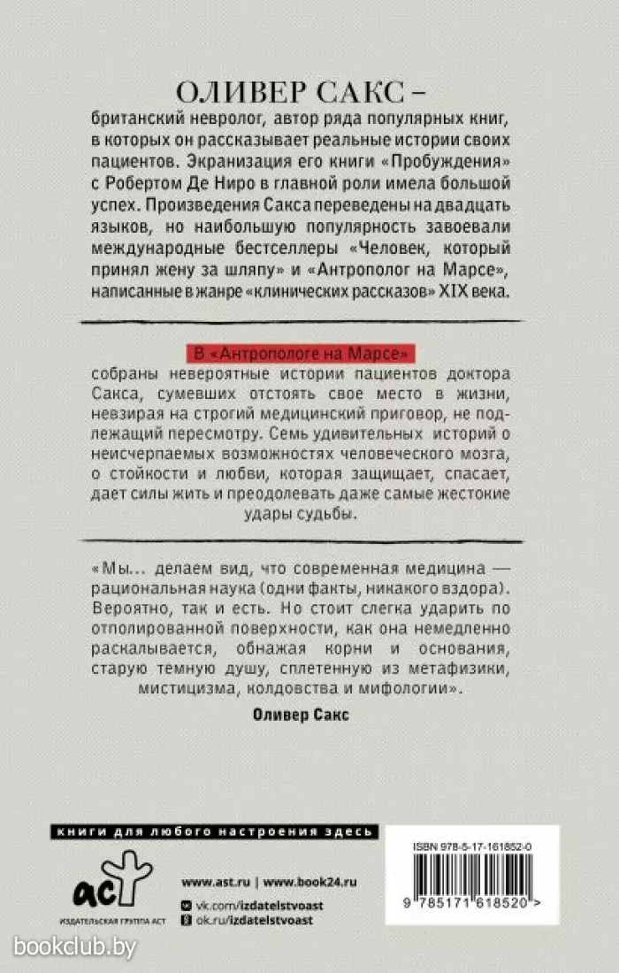 В "Антропологе на Марсе" собраны невероятные истории пациентов доктора Сакса, сумевших отстоять свое место в жизни, невзирая на строгий медицинский приговор, не подлежащий пересмотру. Семь удивительных историй о неисчерпаемых возможностях человеческого мозга, о стойкости и любви, которая защищает, спасает, дает силы жить и преодолевать даже самые жестокие удары судьбы.