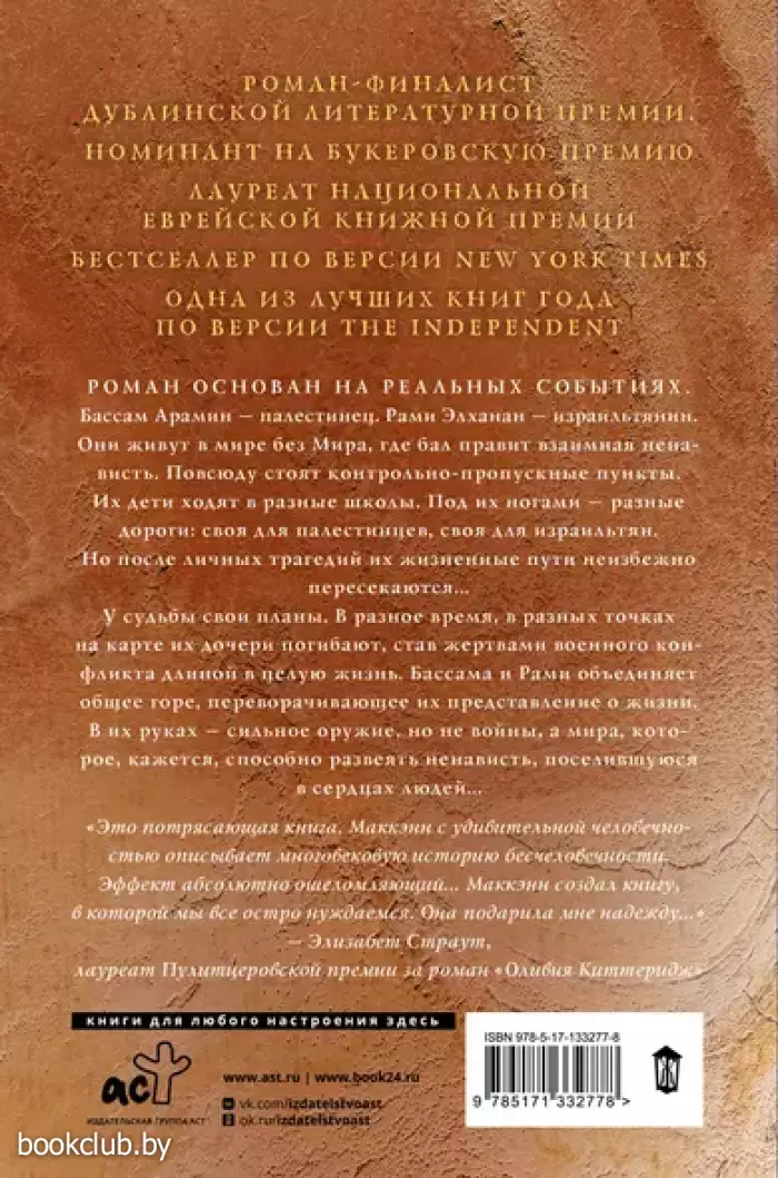РОМАН ОСНОВАН НА РЕАЛЬНЫХ СОБЫТИЯХ Бассам Арамин — палестинец. Рами Элханан — израильтянин. Они живут в мире без Мира, где бал правит взаимная ненависть. Повсюду стоят контрольно-пропускные пункты. Их дети ходят в разные школы. Под их ногами — разные дороги: своя для палестинцев, своя для израильтян. Но после личных трагедий их жизненные пути неизбежно пересекаются… У судьбы свои планы. В разное время, в разных точках на карте их дочери погибают, став жертвами военного конфликта длиной в целую жизнь. Бассама и Рами объединяет общее горе, переворачивающее их представление о жизни. В их руках — сильное оружие, но не войны, а мира, которое, кажется, способно развеять ненависть, поселившуюся в сердцах людей… «Это потрясающая книга. Маккэнн с удивительной человечностью описывает многовековую историю бесчеловечности. Эффект абсолютно ошеломляющий… Маккэнн создал книгу, в которой мы все остро нуждаемся. Она подарила мне надежду…» — Элизабет Страут, лауреат Пулитцеровской премии за роман «Оливия Киттеридж» • Лауреат Национальной еврейской книжной премии • Бестселлер по версии New York Times • Одна из лучших книг года по версии The Independent