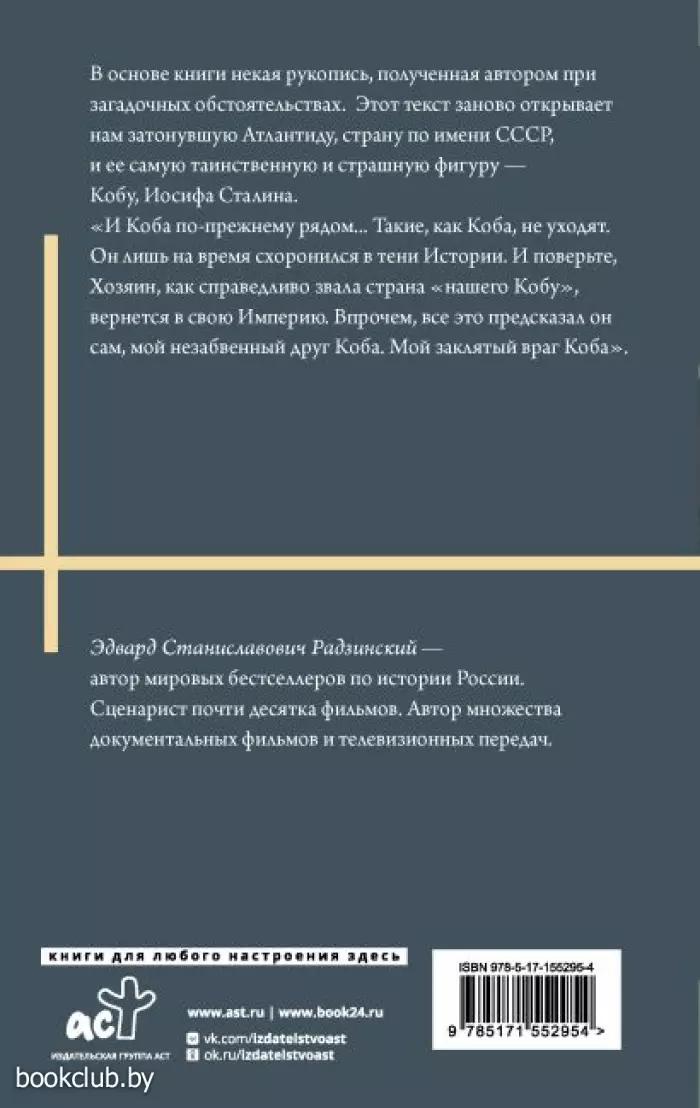 В основе книги некая рукопись, полученная автором при загадочных обстоятельствах. Этот текст заново открывает нам затонувшую Атлантиду, страну по имени СССР, и ее самую таинственную и страшную фигуру - Кобу, Иосифа Сталина.