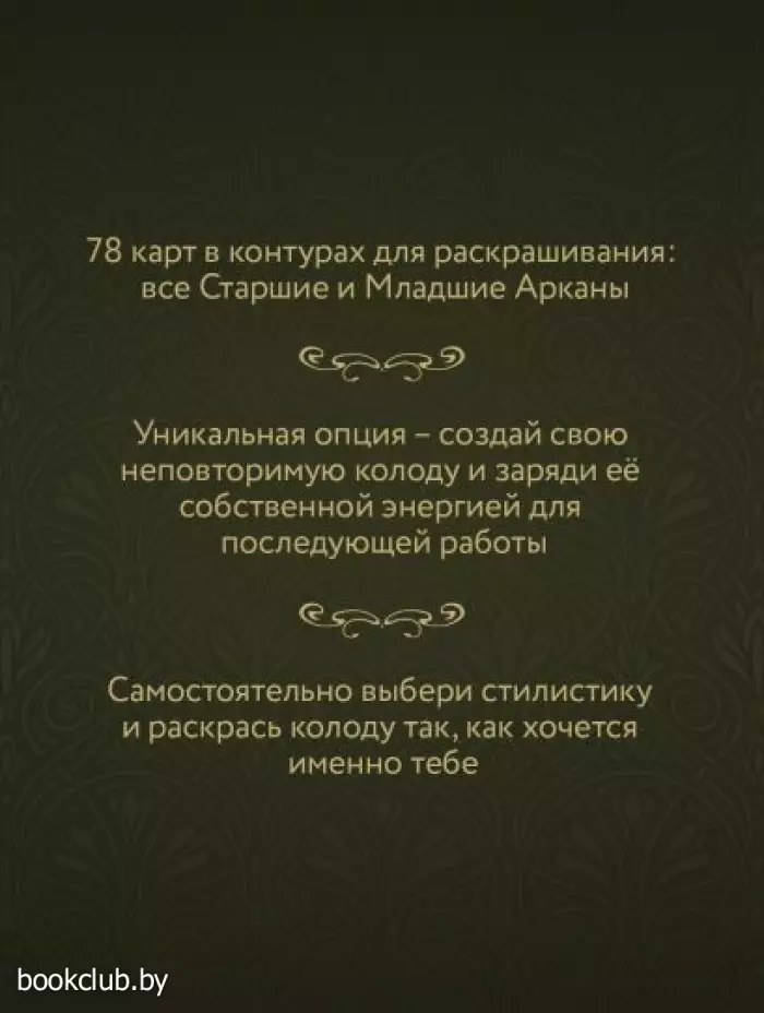 Вселенную "Ар-нуво Таро", созданную художницей Юлией Соколовой, населяют образы 78 карт колоды Уэйта. Вместе с их персонажами вы совершите прогулку во времени: Античность, Средневековье, эпоха романтизма и даже русский стиль объединятся с помощью изобразительных средств модерна. Раскрашивая прекрасные орнаменты и струящиеся драпировки, вы разберетесь в своих желаниях, прочитаете намерения окружающих и найдете ответы на волнующие вопросы.