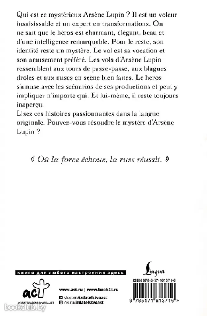 Кто же этот загадочный Арсен Люпен? Он неуловимый грабитель и искусный мастер перевоплощений. Известно только, что герой обаятельный, элегантный, красивый и необычайно умный, в остальном его личность остается загадкой. Воровство — это его призвание и любимое развлечение. Кражи Арсена Люпена похожи на ловкие фокусы, веселые розыгрыши и искусные постановки пьес. Герой забавляется сценариями своих постановок и может вовлечь в них любого. Сам же всегда остается незамеченным. Прочитайте эти увлекательные истории на языке оригинала. Под силу ли вам раскрыть тайны Арсена Люпена?