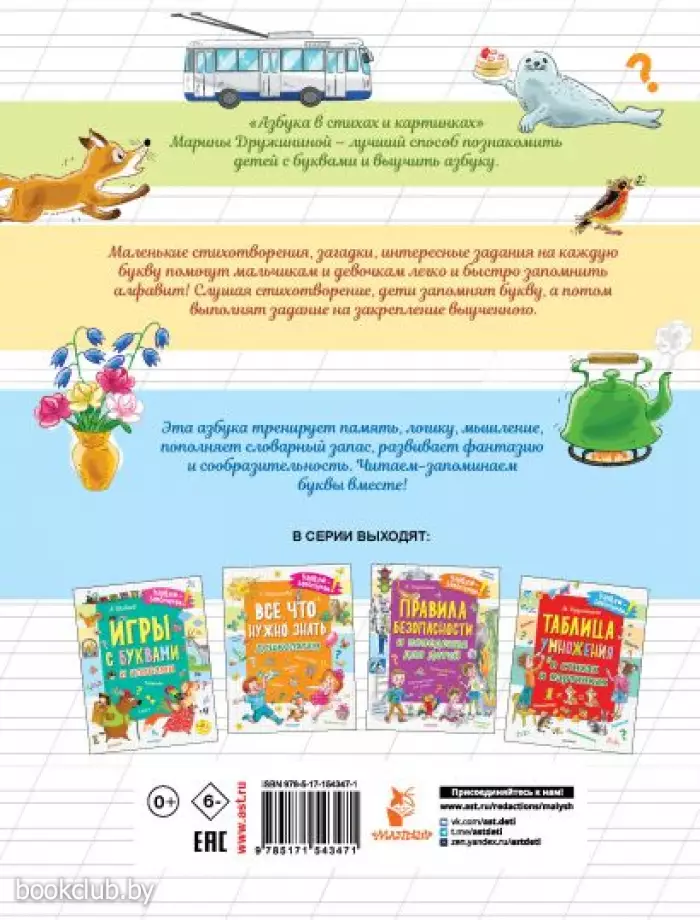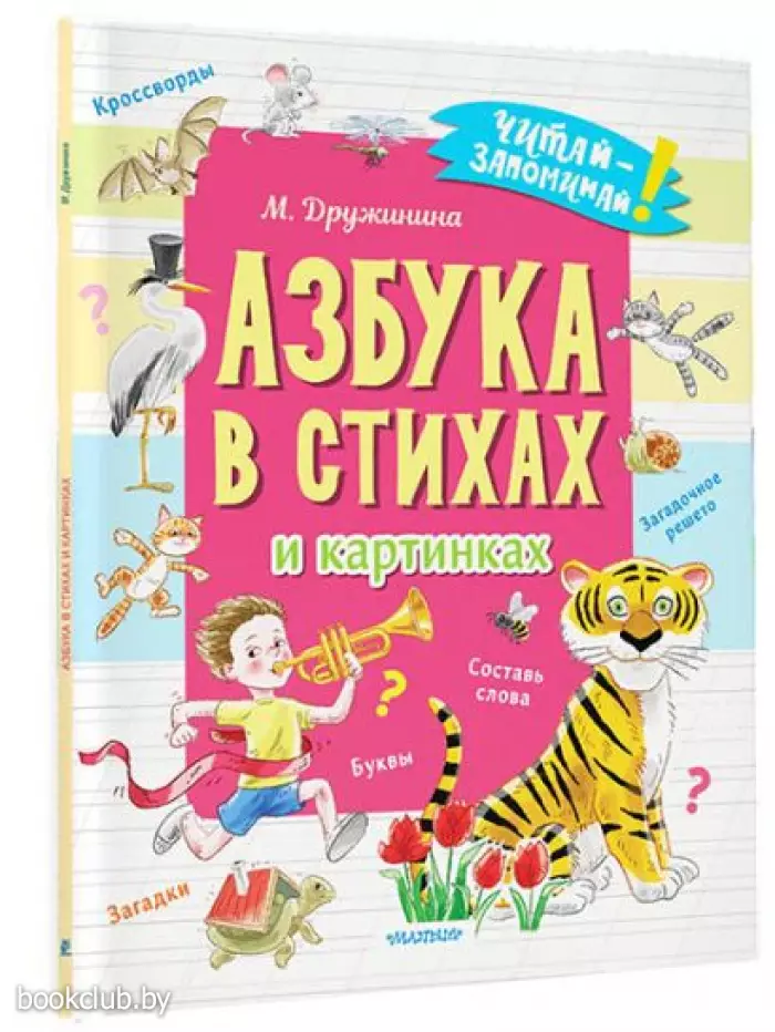 «Азбука в стихах и картинках» Марины Дружининой – это самая необходимая книга для первого знакомства ребёнка с алфавитом. Ребёнок увидит букву, послушает весёлые стихотворения, загадки, выполнит интересные задания на каждую букву и мгновенно запомнит весь алфавит. В книге на отдельной странице дан весь алфавит для наглядности и проверки знаний детей. Эта азбука тренирует память, логику, мышление, пополняет словарный запас, развивает фантазию и сообразительность. Читаем-запоминаем буквы вместе! Книги серии «Читай-запоминай!» – отличный помощник родителям для обучения детей в игре.