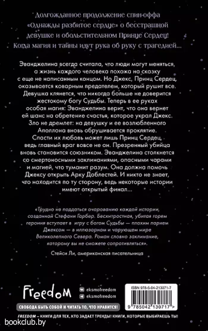 Продолжение яркого спин-оффа цикла о шоу Караваль «Однажды разбитое сердце» о бесстрашной девушке и обольстительном Принце Сердец! Когда магия и тайны идут рука об руку с трагедией… Страшное проклятие вынуждает Эванджелину вновь вступить в хрупкий союз с Принцем Сердец. Только в этот раз многое изменилось. Джекс — не единственный, кого Эванджелине стоит опасаться, но в то же время лишь ему она может доверять. Чтобы снять чары, Эванджелине и Джексу придется вновь встретиться со старыми друзьями, столкнуться с новыми врагами и магией, туманящей разум. Привыкшая всегда доверять своему сердцу, отныне Эванджелина боится, что больше не может этого сделать… Строки Стефани Гарбер разлетаются на цитаты. Ее стиль — притягательная, обволакивающая магия, ее сюжеты — несбыточные, но такие осязаемые, стоит лишь протянуть руку — и сразу почувствуешь их тепло. «В этой книге Стефани Гарбер раскрывает твою душу на максимум и будоражит потаенные чувства. Я ощущала все: любовь, страх, беспокойство, гнев, тоску и даже боль». Роман «Однажды разбитое сердце» — бестселлер № 1 по версии New York Times, финалист премии Goodreads Choice Award, Выбор американской книжной ассоциации Indie Next. Роман «Баллада о проклятой любви» стал номинантом на премию Goodreads Choice Award. Более 65 тыс. отзывов на серию на Amazon! Книги издательства «ЭКСМО» из серии «Young Adult. Мировой бестселлер. Караваль» - отличное приобретение для вас и ваших близких. Для вашего удобства при оформлении заказа по телефону назовите код товара: 416991