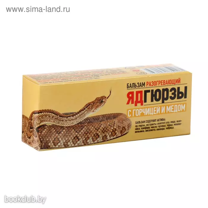 Разогревающий бальзам со змеиным ядом, яд гюрзы оказывает биостимулирующее действие и согревающий эффект в зоне нанесения. А благодаря входящим в состав экстракту золотого уса крапивы окопника перца и других натуральных компонентов, обладает питательными и защитными свойствами. Бальзам яд гюрзы с горчицей и медом за счет высокой концентрации активных веществ обладает питательными и защитными свойствами. Мед и горчица оказывают мягкий разогревающий эффект продолжительного действия, а также содержат большое количество полезных веществ, яд гюрзы с имбирем и золотым усом обладает питательными и защитными свойствами. Имбирь и яд гюрзы обладают местнораздражающим и согревающим эффектом, великолепно расслабляют. Золотой ус оказывает антиоксидантное воздействие и способен нейтрализовать монооксид азота (NO), участвующего в процессе образования болевых ощущений.