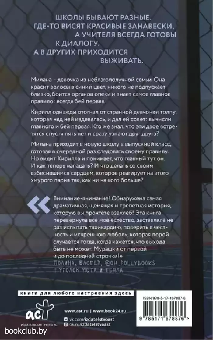 Милана – девочка из неблагополучной семьи. Она красит волосы в синий цвет, никого не подпускает близко, боится органов опеки и знает самое главное правило: всегда бей первая. Кирилл однажды отогнал от странной девчонки толпу, которая над ней издевалась, и дал ей совет: вычисли главного и бей первая. Кто же знал, что эти двое встретятся спустя пять лет и сразу узнают друг друга? Милана приходит в новую школу в выпускной класс, готовая в очередной раз следовать своему правилу. Но видит Кирилла и понимает, что главный тут он. И как теперь нападать? И что делать со своим взбесившимся сердцем, которое реагирует на этого хмурого парня так, как ни на кого больше?
