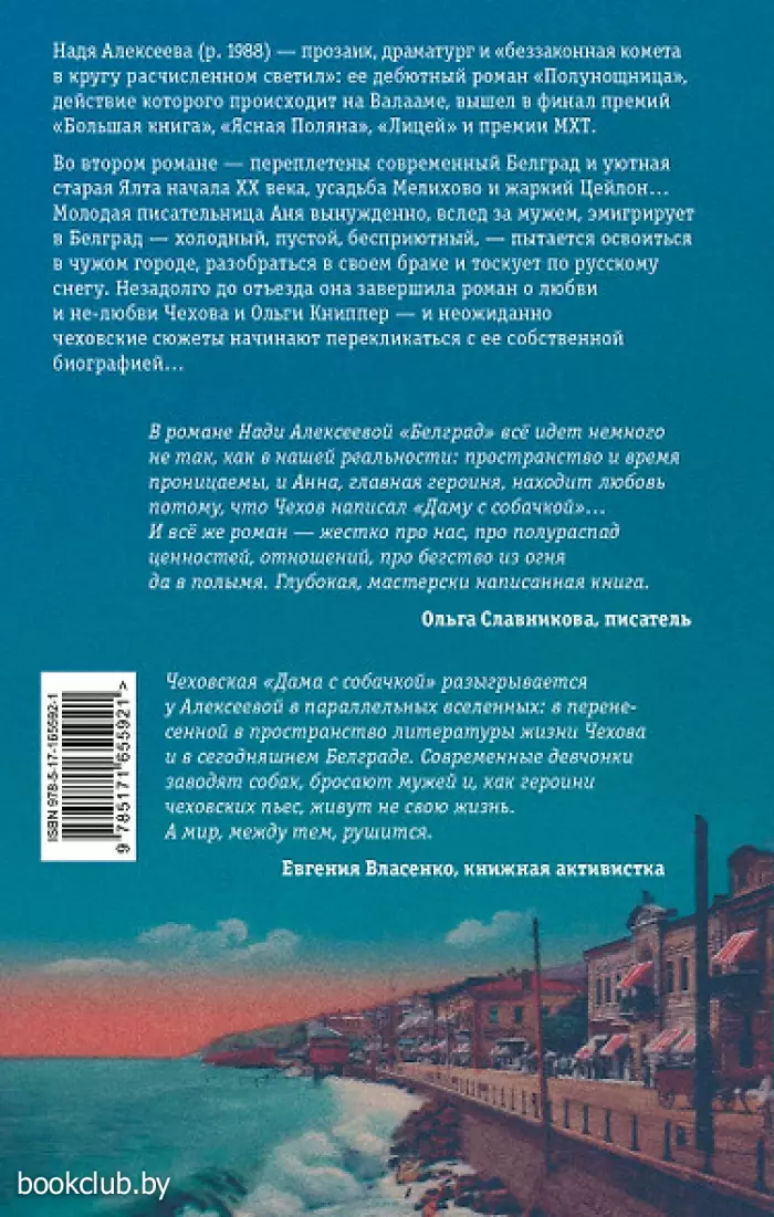 Во втором романе — переплетены современный Белград и уютная старая Ялта начала ХХ века, усадьба Мелихово и жаркий Цейлон… Молодая писательница Аня вынужденно, вслед за мужем, эмигрирует в Белград — холодный, пустой, бесприютный, — пытается освоиться в чужом городе, разобраться в своем браке и тоскует по русскому снегу. Незадолго до отъезда она завершила роман о любви и не-любви Чехова и Ольги Книппер — и неожиданно чеховские сюжеты начинают перекликаться с ее собственной биографией