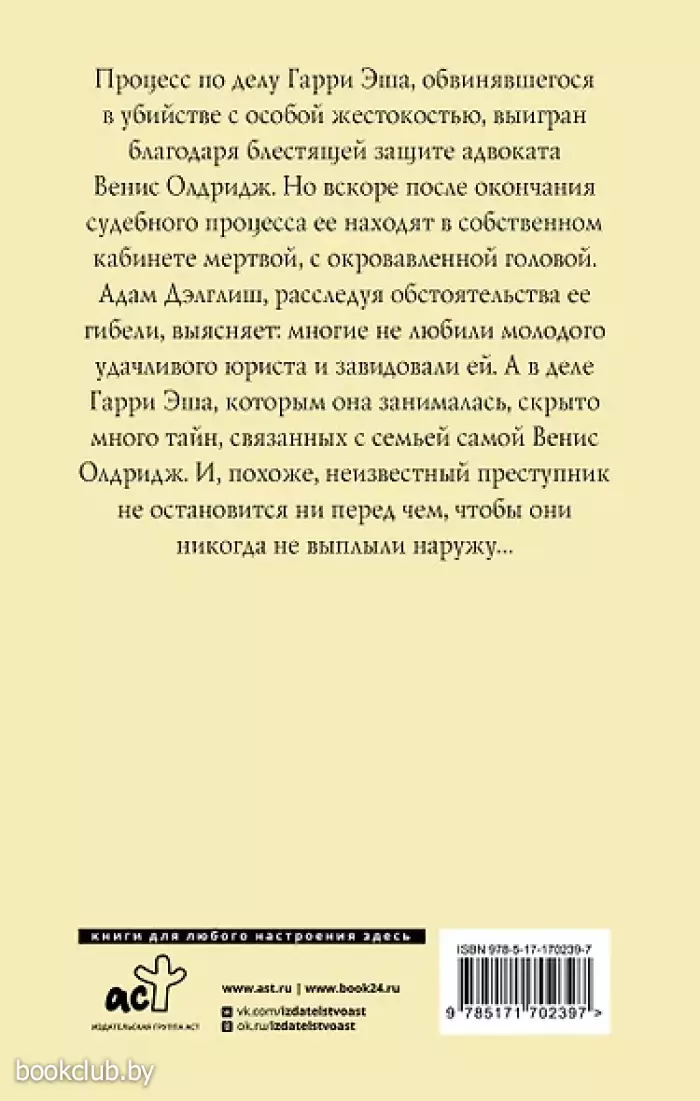 Процесс по делу Гарри Эша, обвинявшегося в убийстве с особой жестокостью, выигран благодаря блестящей защите адвоката Венис Олдридж. Но вскоре после окончания судебного процесса ее находят в собственном кабинете мертвой, с окровавленной головой. Адам Дэлглиш, расследуя обстоятельства ее гибели, выясняет: многие не любили молодого удачливого юриста и завидовали ей. А в деле Гарри Эша, которым она занималась, скрыто много тайн, связанных с семьей самой Венис Олдридж. И, похоже, неизвестный преступник не остановится ни перед чем, чтобы они никогда не выплыли наружу…