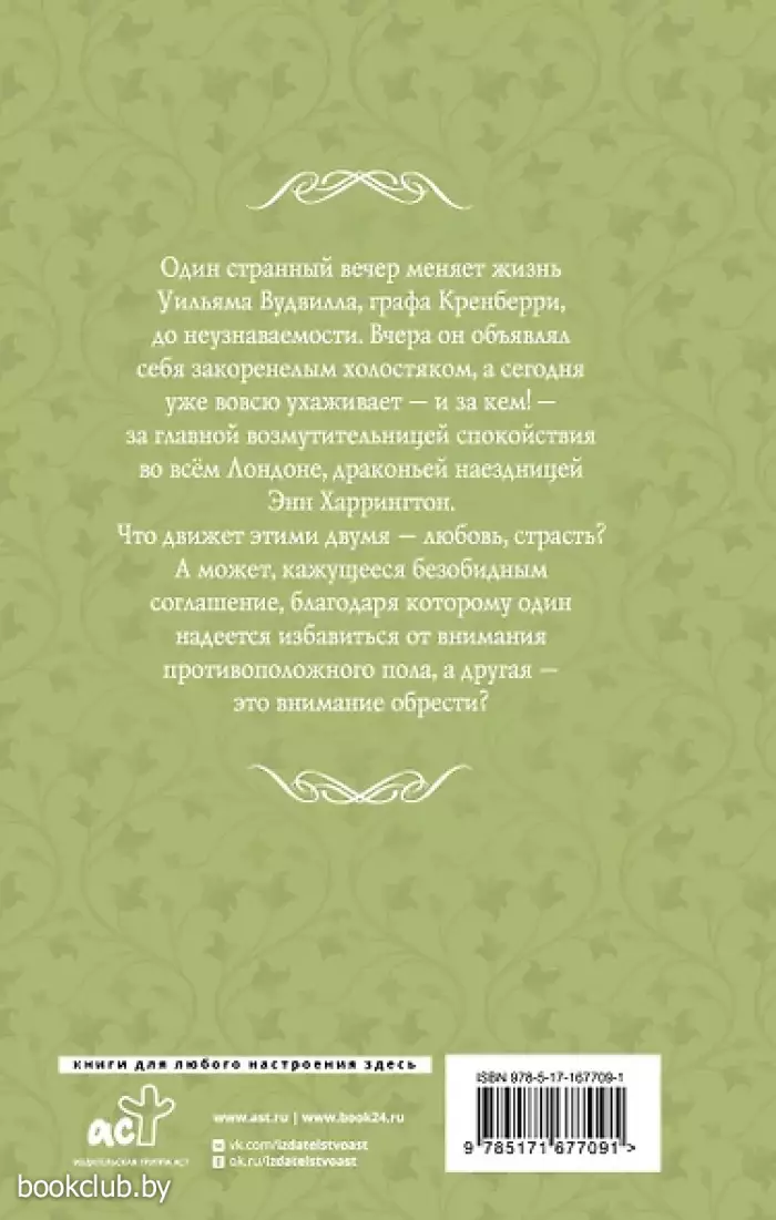 Один странный вечер меняет жизнь Уильяма Вудвилла, графа Кренберри, до неузнаваемости. Вчера он объявлял себя закоренелым холостяком, а сегодня уже вовсю ухаживает — и за кем! — за главной возмутительницей спокойствия во всём Лондоне, драконьей наездницей Энн Харрингтон. Что движет этими двумя — любовь, страсть? А может, кажущееся безобидным соглашение, благодаря которому один надеется избавиться от внимания противоположного пола, а другая — это внимание обрести?