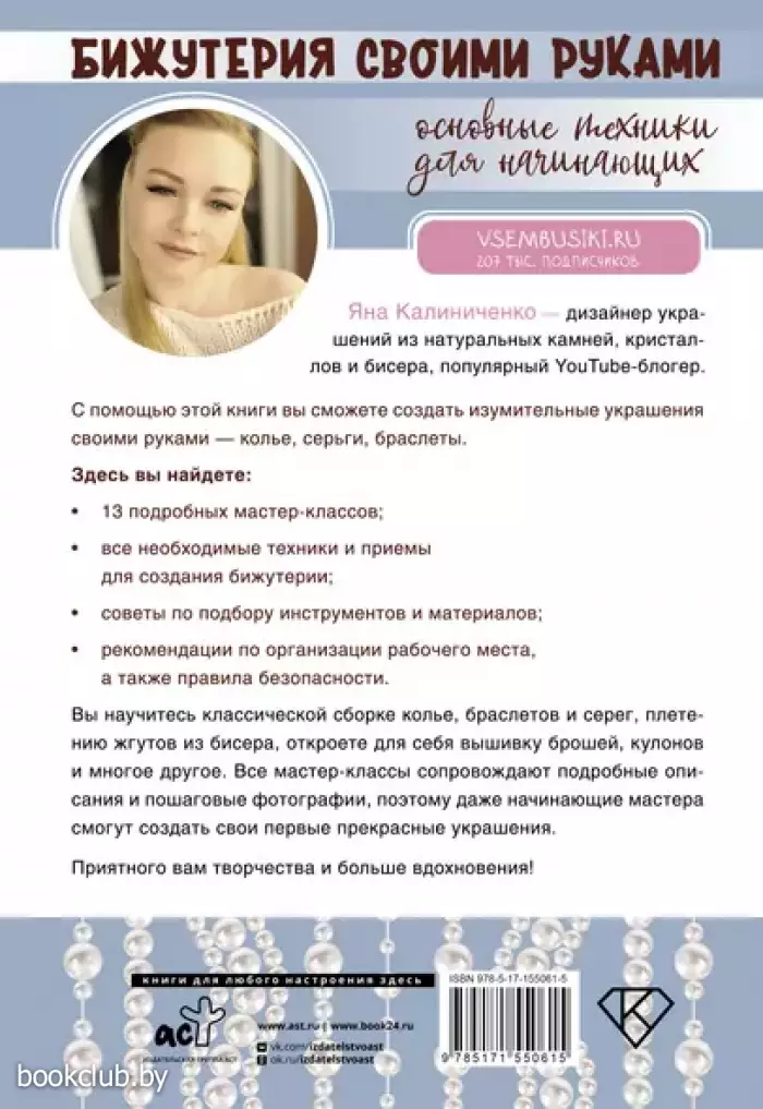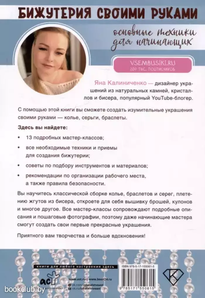 Вы научитесь классической сборке колье, браслетов и серег, плетению жгутов из бисера, откроете для себя вышивку брошей, кулонов и многое другое. Все мастер-классы сопровождают подробные описания и пошаговые фотографии, поэтому даже начинающие мастера смогут создать свои первые прекрасные украшения.