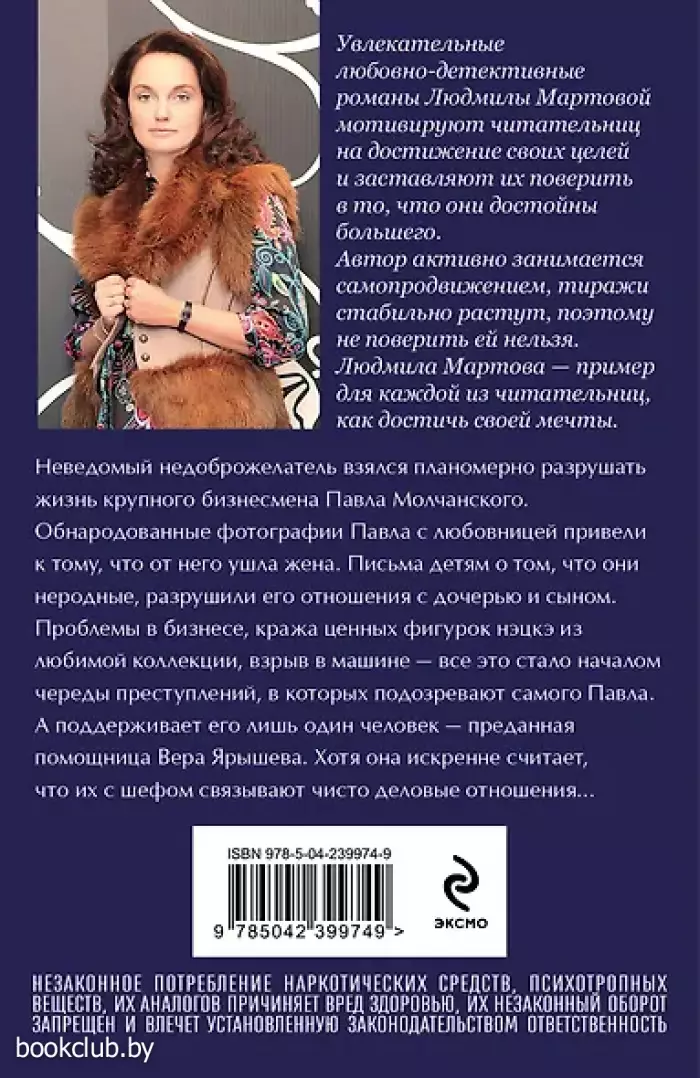 НЕЗАКОННОЕ ПОТРЕБЛЕНИЕ НАРКОТИЧЕСКИХ СРЕДСТВ, ПСИХОТРОПНЫХ ВЕЩЕСТВ, ИХ АНАЛОГОВ ПРИЧИНЯЕТ ВРЕД ЗДОРОВЬЮ, ИХ НЕЗАКОННЫЙ ОБОРОТ ЗАПРЕЩЕН И ВЛЕЧЕТ УСТАНОВЛЕННУЮ ЗАКОНОДАТЕЛЬСТВОМ ОТВЕТСТВЕННОСТЬ.Неведомый недоброжелатель взялся планомерно разрушать жизнь крупного бизнесмена Павла Молчанского. Обнародованные фотографии Павла с любовницей привели к тому, что от него ушла жена. Письма детям о том, что они неродные, разрушили его отношения с дочерью и сыном. Проблемы в бизнесе, кража ценных фигурок нэцкэ из любимой коллекции, взрыв в машине — все это стало началом череды преступлений, в которых подозревают самого Павла… А поддерживает его лишь один человек — преданная помощница Вера Ярышева искренне считает, что их с шефом связывают чисто деловые отношения… Людмила Мартова — мастер увлекательной детективной мелодрамы, автор захватывающих остросюжетных историй. Их отличают закрученная детективная интрига, лихой финал с неожиданной развязкой и, конечно же, яркая любовная линия. Героини романов Людмилы Мартовой — современные молодые женщины, которые точно знают, чего хотят от жизни. Книги издательства «ЭКСМО» из серии «Желание женщины. Детективные романы Л. Мартовой. Новое оформление (обложка)» станут прекрасным дополнением вашей библиотеки. Для вашего удобства при оформлении заказа по телефону назовите код товара: 416997
