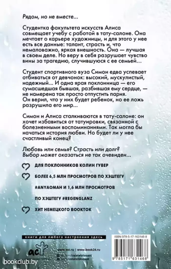 - Бестселлер Spiegel. Хит немецкого BookTok. Более 6 500 000 просмотров по хэштегу #anyaomah и 1 600 000 просмотров по хэштегу #regenglanz.