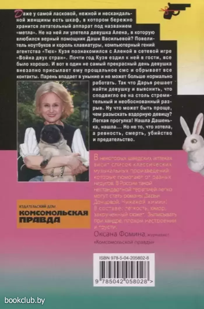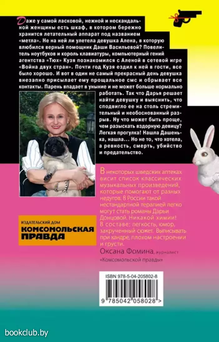 Даже у самой ласковой, нежной и не скандальной женщины есть шкаф, в котором бережно хранится летательный аппарат под названием «метла». Не на ней ли улетела девушка Алена, в которую влюбился верный помощник Даши Васильевой? Повелитель ноутбуков и король клавиатуры, компьютерный гений агентства «Тюх» Кузя познакомился с Аленой в сетевой игре «Война двух стран». Почти год Кузя ездил к ней в гости, все было хорошо. И вот в один не самый прекрасный день девушка внезапно присылает ему прощальную смс и обрывает все контакты. Парень впадает в уныние и не может больше нормально работать. Так что Дарья решает найти девушку и выяснить, что сподвигло ее на столь стремительный и необоснованный разрыв. Ну что может быть проще чем разыскать вздорную девицу? Легкая прогулка! Нашла Дашенька, нашла... Но не то что хотела, а ревность, смерть, убийство и предательство.