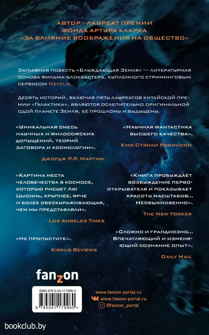 Заглавная повесть "Блуждающая Земля" - литературная основа фильма-блокбастера, купленного стриминговым сервисом Netflix. Десять историй, включая пять произведений - лауреатов китайской премии "Галактика", являются ослепительно оригинальной одой планете Земля, ее прошлому и будущему. С меланхоличным, но острым пониманием человеческой природы, Лю показывают попытки человечества понять, найти себя и, прежде всего, выжить в пустоте космоса. Лю Цысинь переносит читателя на край вселенной и в конец времен, чтобы рассказать о людях с судьбой, которую мы никогда бы не смогли себе представить.