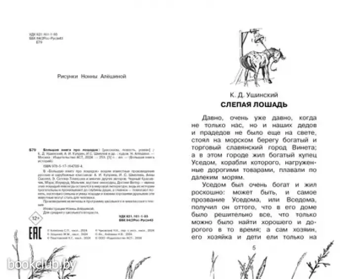 В "Большую книгу про лошадок" вошли известные произведения русских и зарубежных классиков: А. И. Куприна, И. С. Шмелева, Анны Сьюэлл, Э. Сетона-Томпсона и многих других авторов. Черный Красавчик, Мэри, Изумруд, Мальчик, мустанг-иноходец, Догони-Ветер — имена этих лошадей навсегда останутся в мировой литературе, ведь их истории трогательны и пронизывают до глубины души, а главное — помогают понять, насколько сильны и умны лошади и какими хорошими друзьями эти животные могут стать для человека.