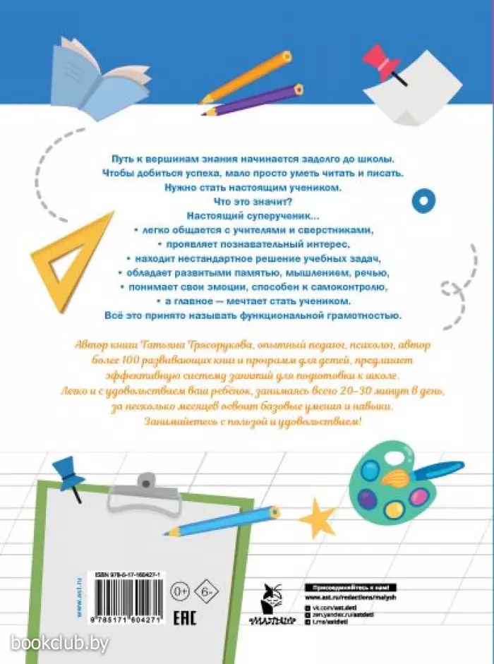Что умеет настоящий суперученик? Легко общаться с учителями и сверстниками, нестандартно подходит к решению задач, обладает развитыми памятью, мышлением и речью. Все эти навыки принято называть функциональной грамотностью. Именно она помогает ребенку учиться в школе легко и с удовольствием! Автор книги Татьяна Трясорукова — опытный педагог и психолог — подготовила увлекательные тестовые задания, которые понравятся даже самому непоследливому малышу. Все задания сопровождаются подсказками для родителей и соответствуют Федеральному государственному образовательному стандарту дошкольного образования. Книга станет прекрасным подарком для будущих отличников.