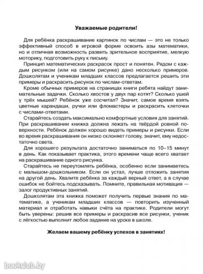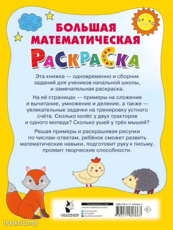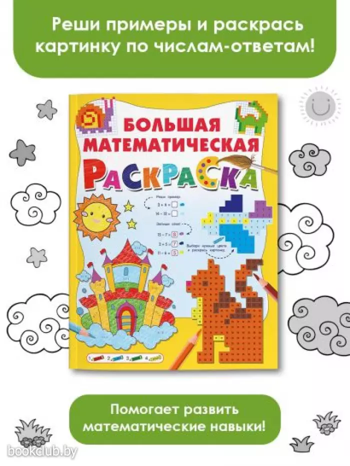 «Большая математическая раскраска» — это сборник арифметических примеров для учеников начальной школы и замечательная книжка-раскраска. Решая примеры и раскрашивая клеточки по числам-ответам, ребёнок сможет развить математические навыки, проявит творческие способности, потренирует мелкую моторику.