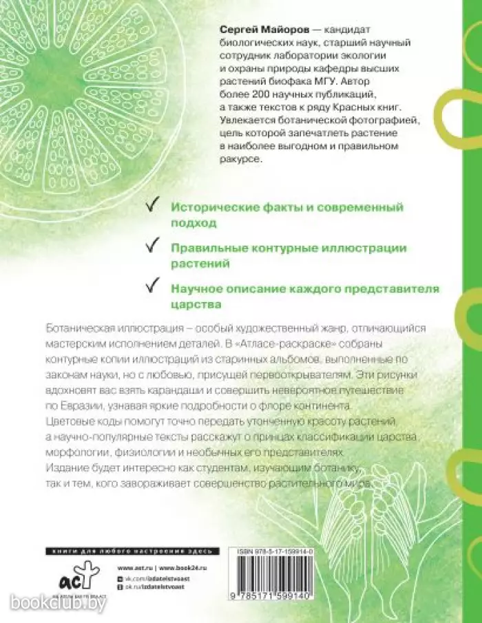 Ботаническая иллюстрация – особый художественный жанр, отличающийся мастерским исполнением деталей. В "Атласе-раскраске" собраны контурные копии иллюстраций из старинных альбомов, выполненные по законам науки, но с любовью, присущей первооткрывателям. Эти рисунки вдохновят вас взять карандаши и совершить невероятное путешествие по Евразии, узнавая яркие подробности о флоре континента. Цветовые коды помогут точно передать утонченную красоту растений, а научно-популярные тексты расскажут о принцах классификации царства, морфологии, физиологии и необычных представителях. Издание будет интересно как студентам, изучающим ботанику, так и тем, кого завораживает совершенство растительного мира.