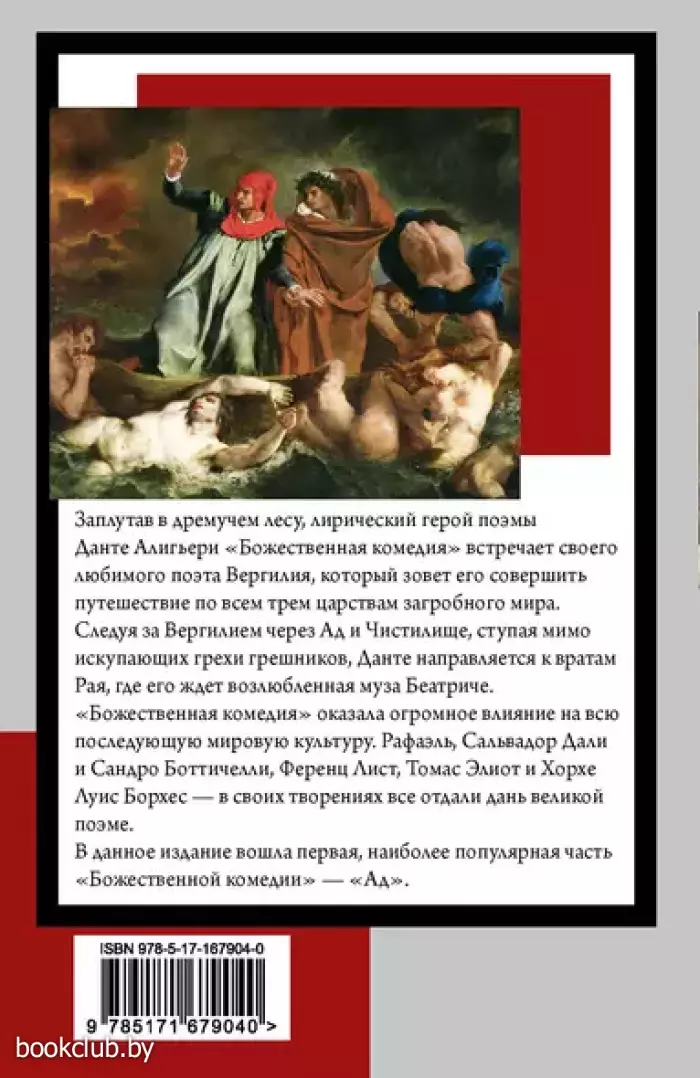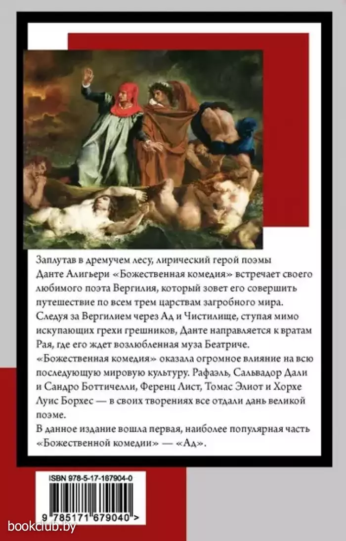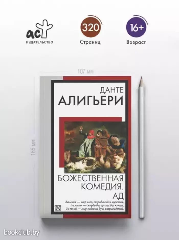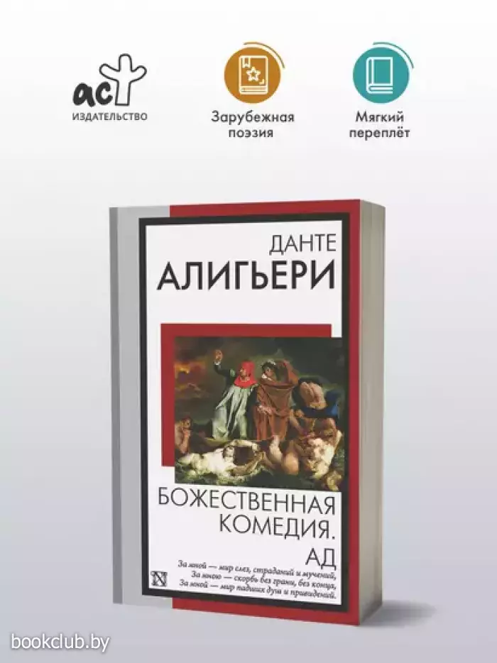 Заплутав в дремучем лесу, лирический герой поэмы Данте Алигьери «Божественная комедия» встречает своего любимого поэта Вергилия, который зовет его совершить путешествие по всем трем царствам загробного мира. Следуя за Вергилием через Ад и Чистилище, ступая мимо искупающих грехи грешников, Данте направляется к вратам Рая, где его ждет возлюбленная муза Беатриче. «Божественная комедия» оказала огромное влияние на всю последующую мировую культуру. Рафаэль, Сальвадор Дали и Сандро Боттичелли, Ференц Лист, Томас Элиот и Хорхе Луис Борхес — в своих творениях все отдали дань великой поэме. В данное издание вошла первая, наиболее популярная часть «Божественной комедии» — «Ад».