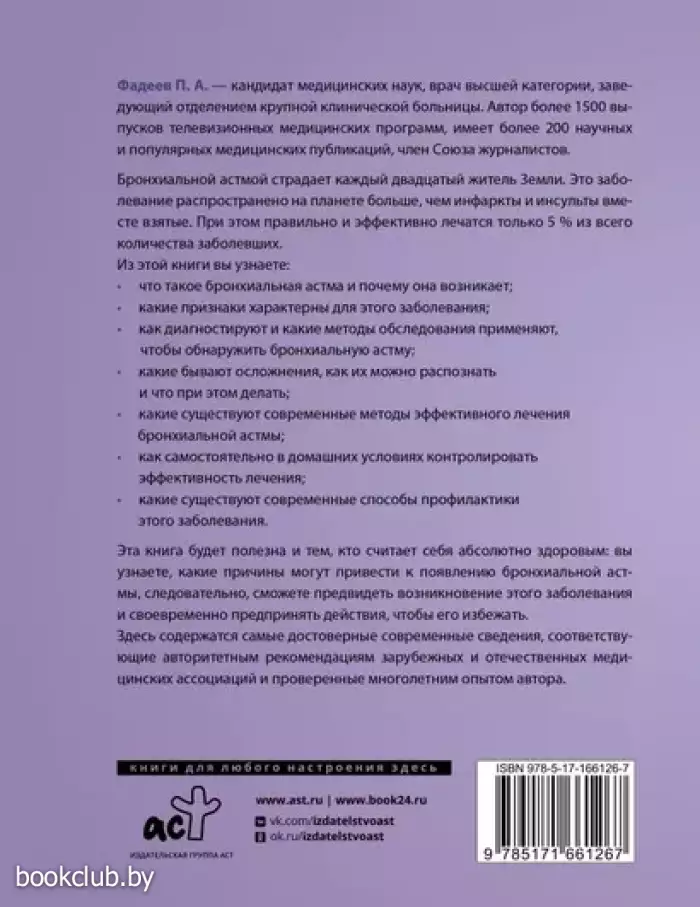 В книге в доступной форме изложены все основные вопросы, связанные с одним из самых массовых заболеваний человечества — бронхиальной астмой. Читатель узнает, что такое бронхиальная астма и почему она возникает; как диагностируют это заболевание; какие бывают осложнения и как их можно распознать; какие существуют современные методы профилактики и лечения бронхиальной астмы; как самостоятельно контролировать эффективность лечения. Здесь содержатся самые достоверные и современные сведения, соответствующие авторитетным рекомендациям зарубежных и отечественных медицинских ассоциаций и проверенные многолетним опытом автора. Для широкого круга читателей.
