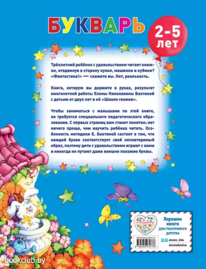 Авторский букварь Бахтиной Елены Николаевны известен в рынке уже многие годы. Огромное количество детей прочитали свои первые слова с его помощью. Автор гарантирует, что уникальное пособие поможет 2–3-летнему малышу за 4 месяца научиться читать. Если ребёнку 4–5 лет, то для этого ему понадобится 1 месяц, ну а 7-летний ребёнок освоит грамоту за 1–2 недели. «Букварь» составлен так, чтобы работать по нему было легко и удобно как взрослым, так и детям. Сначала малыш знакомиться с буквами, запоминает их образ, потом переходит к алфавиту. Затем составляет из букв слоги, которые повторяет много раз, пока не выучит их и не поймет принцип их образования. И только после этого – начинает читать слова по слогам. Прекрасные иллюстрации помогут сделать процесс чтения простым и интересным, превращая его в весёлую игру. Пособие адресовано родителям, воспитателям детских садов, которые могут его использовать как для индивидуальных занятий, так и в ДОУ.