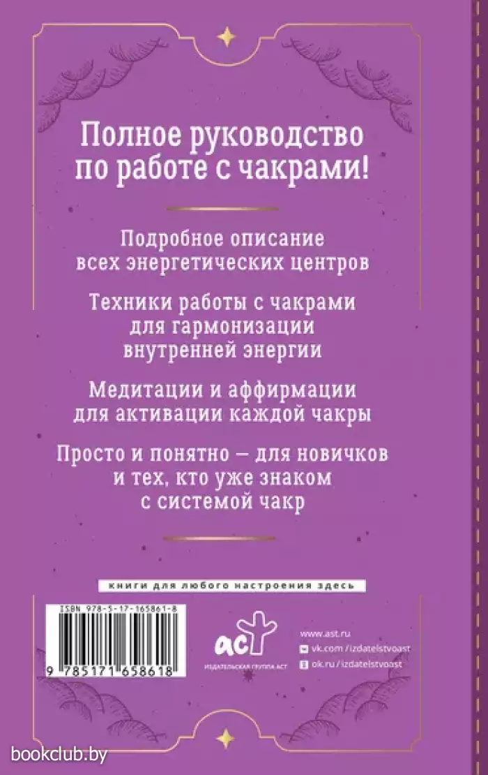 Наше тело — не просто физическая оболочка. Это сложный и отлаженный механизм, который работает благодаря чакрам — энергетическим центрам, живущим в постоянном контакте с энергией Вселенной. Для того чтобы жить в гармонии с собой, нужно быть здоровым физически и духовно. Это определяет нашу силу, волю и «ресурсность». Чакры влияют на наше физическое, умственное и эмоциональное благополучие. Хроническая усталость, плохое самочувствие, недовольство собой означают, что энергия в чакрах течет неправильно. В этой книге вы найдете подробное описание каждой чакры и узнаете о техниках проработки энергетических центров, чтобы привлечь в жизнь любовь, деньги, здоровье, удачу и успех. Вы научитесь входить в поток с энергией Вселенной и привнесете равновесие и гармонию во все сферы своей жизни. Физическое тело — не единственное у человека. Так почему мы привыкли заботиться только о нем? Поддержание здоровья энергетических центров также важно. Работа с чакрами позволит вам решить внутренние проблемы и улучшит качество жизни. Это настоящая забота о себе.