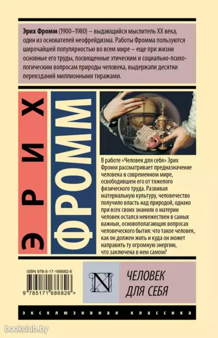 В работе «Человек для себя» Эрих Фромм рассматривает предназначение человека в современном мире, освободившем его от тяжелого физического труда. Развивая материальную культуру, человечество получило власть над природой, однако при всех своих знаниях о материи человек остался невежественен в самых важных, основополагающих вопросах человеческого бытия: что такое человек, как он должен жить и куда он может направить ту огромную энергию, что заключена в нем самом?