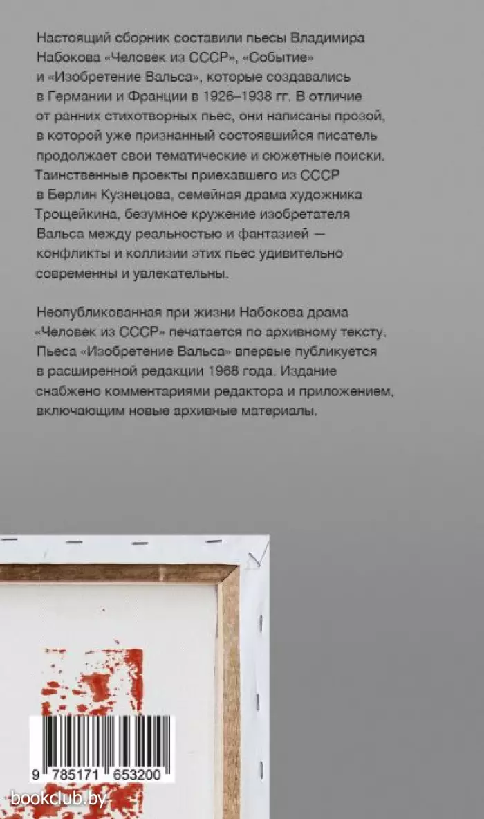 Настоящий сборник составили пьесы Владимира Набокова "Человек из СССР", "Событие" и "Изобретение Вальса", создававшиеся в Германии и Франции в 1926-1938 гг. В отличие от ранних стихотворных пьес, они написаны прозой, в которой уже признанный писатель продолжает свои тематические и сюжетные поиски. Таинственные проекты приехавшего из СССР в Берлин Кузнецова, семейная драма художника Трощейкина, безумное кружение изобретателя Вальса между реальностью и фантазией – конфликты и коллизии этих пьес удивительно современны и увлекательны.