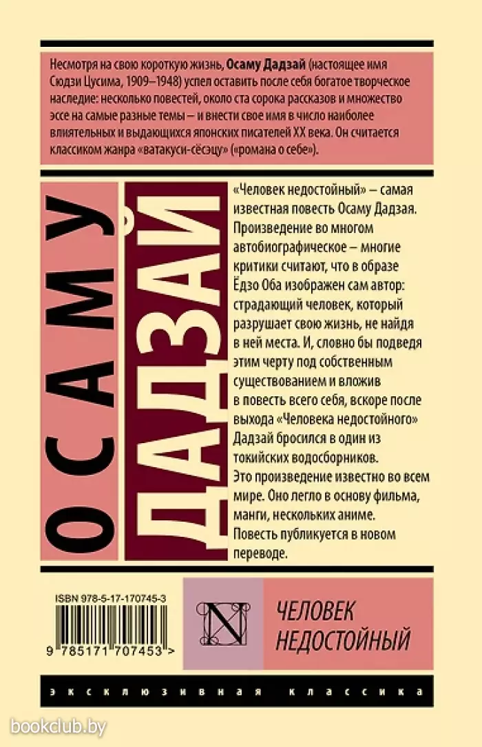 «Человек недостойный» – самая известная повесть Осаму Дадзая. Произведение во многом автобиографическое – многие критики считают, что в образе Ёдзо Оба изображен сам автор: страдающий человек, который разрушает свою жизнь, не найдя в ней места. И, словно бы подведя этим черту под собственным существованием и вложив в повесть всего себя, вскоре после выхода «Человека недостойного» Дадзай бросился в один из токийских водосборников. Это произведение известно во всем мире. Оно легло в основу фильма, манги, нескольких аниме. Повесть публикуется в новом переводе.